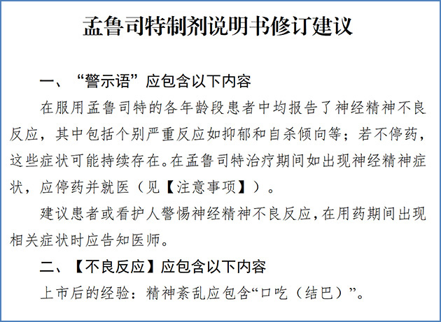 《药品说明书撰写指南》要求“警示语”应置于说明书标题下,以粗体字印刷,并将其所有内容置于黑框内(所以常称之为“黑框警告”),以便使资料醒目。随着上市药品的广泛应用,可能会发现新的严重不良反应,可能会有新的警示语出现,因此要及时更新警示语内容,确保用药者的安全。药物的不良反应监测是一个长期动态的过程。孟鲁司特钠此前说明书已经提到了神经精神的不良反应,随着临床使用范围扩大、用药人群增多,一些少见的不良反应病例会逐渐增多。及时更新说明书,是为了让医生和患者更全面地了解用药风险,从而更精准地指导临床使用。