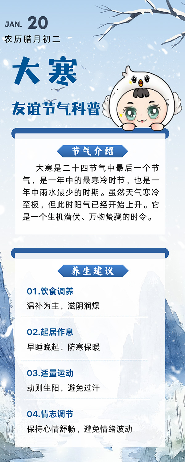 总之,大寒时节养生要顺应自然规律,从饮食、起居、运动、情志等多个方面入手进行综合调养。只有这样,我们才能在这个寒冷的冬季保持身体健康,温暖过冬。